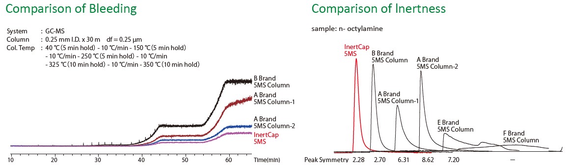 InertCap 5MS, in which liquid phase chemically bonded with 5% diphenyl-95% dimethylpolysiloxane, is a low-polarity column designed for GC/MS analysis with top level of inertness and low bleed.