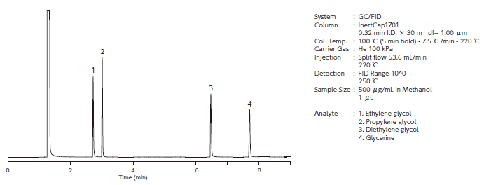 InertCap 1701 is a medium polar column bonded 14 % cyanopropylphenyl and 86 % dimethylpolysiloxane. Containing cyano groups as InertCap 1301 InertCap 1701 has a stronger polarity than InertCap 25, InertCap 1701 is suitable for pesticides screening analyses.