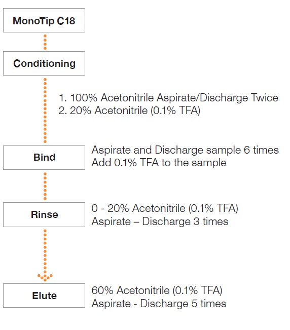 • A MonoTip C18 with a tip volume of 200 μL corresponding to a large volume sample and a MonoTip mini C18 with a volume of 10 μL corresponding to a trace sample were prepared.