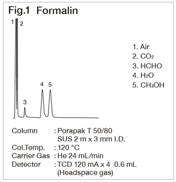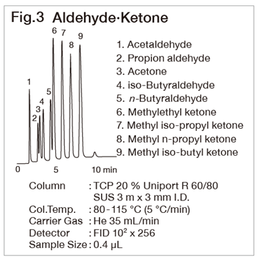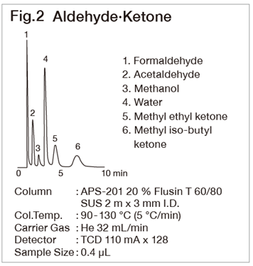 Porapak T shows a good peak of CO2 and APS-201 shows a good peak of water (refer to Fig. 1 and Fig. 2). The sensitivity will be low when analyzing formaldehyde with a FID. However, by methanizing or derivatizing the sample with 2,4-Dinitrophenylhydrazine, it can be analyzed at a low concentration level using FID or FTD.
