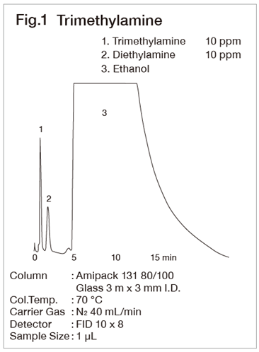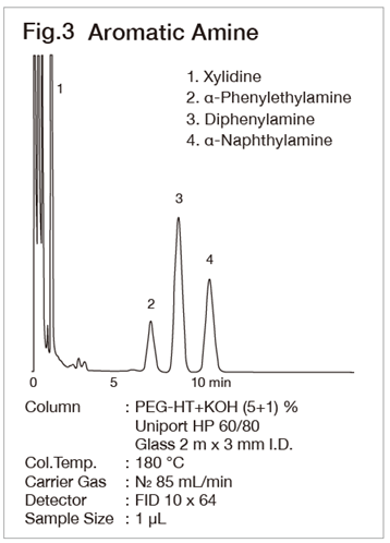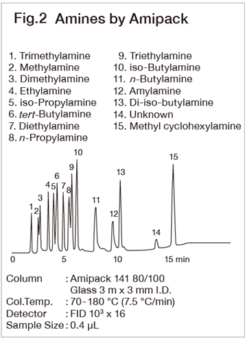 The Amipack 131 is our unique packing material for amine analysis. Generally the packing material, Diglycerol+TEP+KOH is used for the analysis of trace trimethyl amines. However, the Amipack 131 without addition of KOH is more stable (Fig. 1). The Amipack 141 or Unicarbon B is useful for the analysis of mixture of lower amines (Fig. 2). By adding KOH to Unisole 10T or PEG-HT, which has relatively high stability avariety of amines are able to be analyzed on them (Fig. 3).