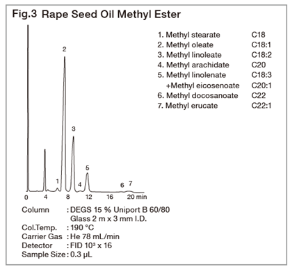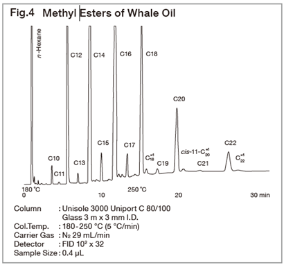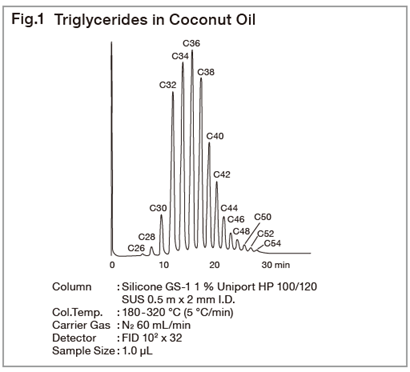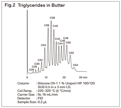Various kinds of ester determinations are associated with food analysis. Oils can be analyzed directly as triglycerides, or as methylesters of fatty acids by transesterification. For direct analysis as triglycerides, the sample is dissolved in a solvent such as hexane, and injected directly onto the gas chromatograph. In the case of samples containing a wide spread of carbon chain lengths, such as fats in dairy products, the triglycerides are first classified into short, medium and long carbon chains by separation using TLC, then each class is extracted and analyzed separately for such analysis. A short column packed with non-polar stationary phase with low loading, and high maximum operating temperature is chosen. Adsorption is unlikely and for analysis at high temperature, use of stailess steel column is highly recommended. Also in order to gain theoretical plates, a fine mesh of support and columns of 2 mm I.D. are commonly used. Fig. 1, 2 are analysis of triglycerides in coconut oil and butter on GS-1, which is equivalent to OV-1, and on OV-1, respectively. Alternatively, the oils can be esterified and analyzed as methyl esters of fatty acids. Three methods are generally used, i.e. boron trifluoride/methanol, sulfuric acid/methanol and sodium meth oxide. Here the boron trifluoride/ methanol method is most common. In this method, the oil is first saponified by heating in a solution of sodium hydroxide/ methanol, and the non-saponified residue is removed. To the saponified product, 14 % boron trifluoride/methanol solution is added, then conduct reaction mixture heated under refluxing in the water bath. When the reaction is completed, an ester layer is formed on methanol layer. After cooling, the ester is extracted by shaking vigorously with a mixture of petroleum ether and water, and the either layer is injected onto the gas chromatograph. In order to concentrate the methyl esters in the ether layer, unreacted compounds are completely removed by repeating the extraction several times until the aqueous layer shows no more acidity. Repeating the extraction also appears to be necessary to prolong the lifetime of the column. A fairly good separation of methyl esters of fatty acids of up to C22 can be obtained with Unisole-3000 (Fig. 4).