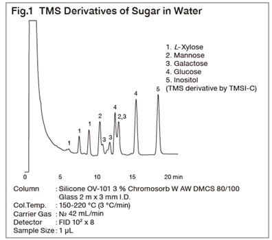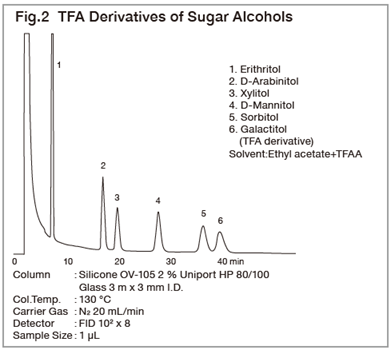 Sugars are found in almost every food. Gas Chromatography is widely used for its trace analysis due to its high resolution efficiency and ability to effectively quantitate. Sugars, however, cannot be analyzed directly. Polysaccharides and large oligosaccharides must be decomposed into their component monosaccharides, and converted to derivatives before analysis. Hydrolysis or methanolysis are used for the common decomposition. In methanolysis, the sugar is heated in a mixture of HCl/methanol so as to give the methyl glycosides of the component monomers. HCl concentration must be varied depending on the sample, and it is convenient to use a prepared HCl/methanol reagent which is adjusted to the desired concentration with anhydrous methanol. After neutralization, the sugar obtained is silylized and analyzed by GC. In the case of aminosaccharides, it is first necessary to acetylate the amino group. As the silylating agent, TMSI-H or TMSI-C can be used. TMSI-C, in particular, has the advantage that the reaction proceeds even when a small amount of water exists, and it is therefore suitable for analysis of monosaccharides in aqueous. After methanolysis, sugars exist as a mixture of α and β anomers in pyranose and furanose forms which give several peaks, resulting difficult identification. In order to obtain a single peak from each sugar, the sugar are first reduced with sodium borohydride and subject to subsequent acetylation then analyzed. Care should be taken as some sugars replaced to give the same sugar alcohol. The packing material have to be changed with the components to be separated; however, it is better to choose a stationary phase that can withstand high temperature, and a silanized support such as Uniport HP.