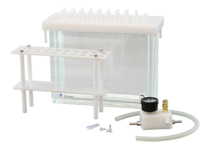 This standard vacuum manifold is recommended for starting solid-phase extraction. A 12 mm/16 mm Rack and waste liquid pump are provided as a set. InertSep Vacuum Manifold have an easy-to access structure to the next waste liquid funnel when performing solid phase extraction.
