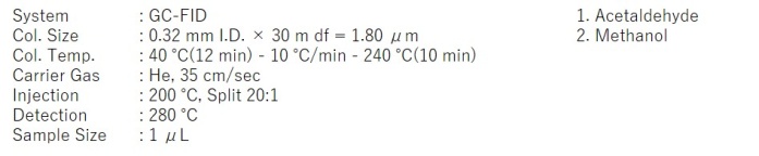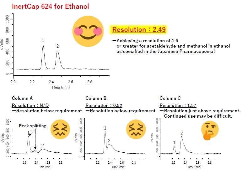 InertCap 624 for Ethanol stably yields the resolution of 1.5 between acetaldehyde and methanol in ethanol specified in the pharmacopoeias.