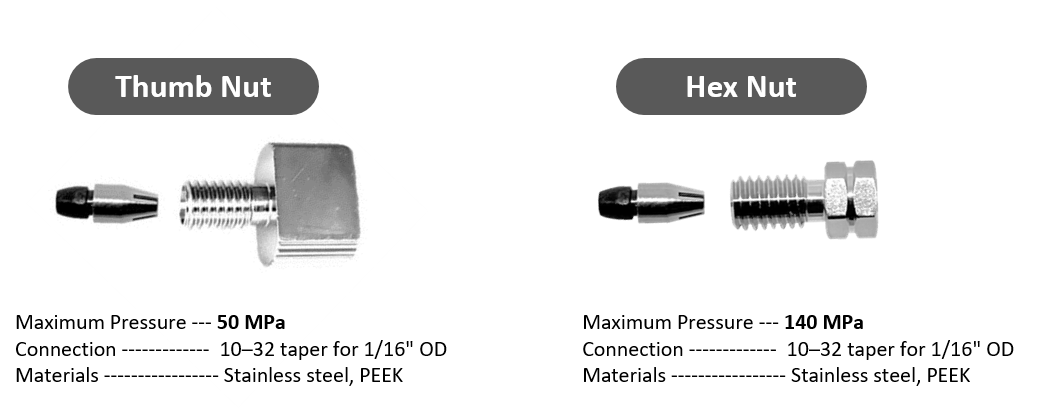 Two types of high-pressure fitting designed for UHPLC are available: Finger-Tight Fitting type and UHPLC type. Each type comprises a stainless-steel nut and a special, reusable ferrule.