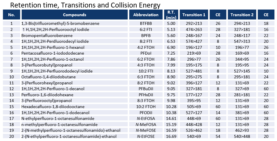 7. Wu R.; Lin H.; Yamazaki E.; Taniyasu S.; Sörengård M.; Ahrens L.; Lam P.; Eun H.; Yamashita N. Simultaneous Analysis of neutral and ionizable per- and poly fluoroalkyl substances in air. Chemosphere. 2021, 280, 130607.