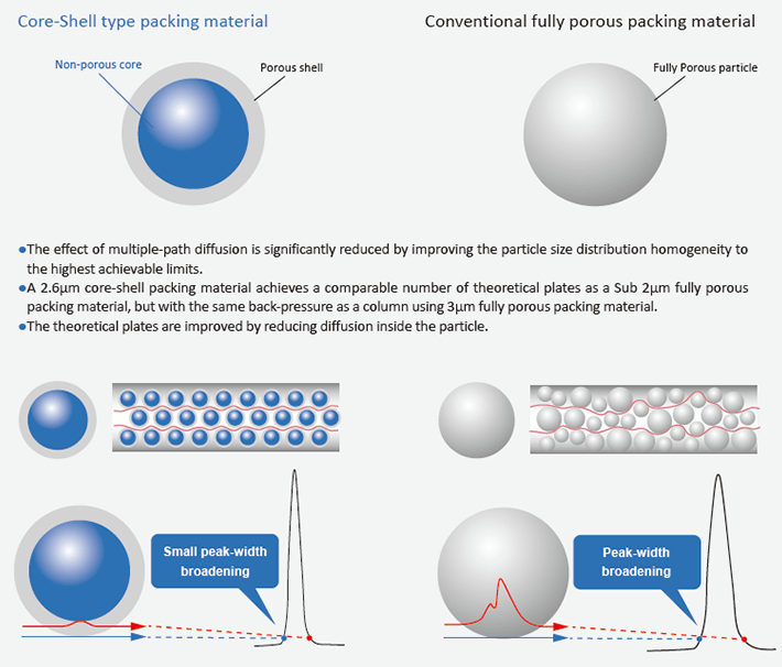 When using a core-shell column, the distribution of molecules in the peak is narrower when the target compound is eluted from the column, resulting in a greater number of theoretical plates.