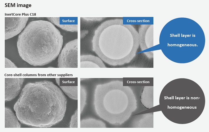 | Base Material | : Core-shell type silica gel | Functional Group | : Octadecyl |