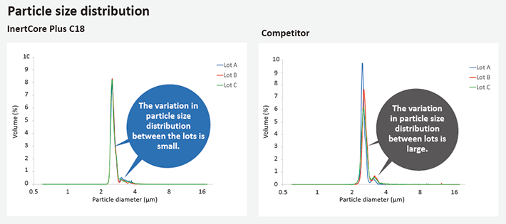 Compare with other core-shell brand columns, InertCore Plus C18 delivery extremely stable batch-to-batch performance.