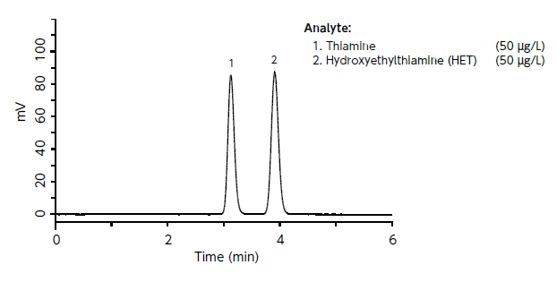 Thiamin separated on ODS columns reacts with potassium ferricyanide under alkaline conditions to produce the fluorescent thiochrome, which is selectively and sensitively detected using a fluorescence detector.