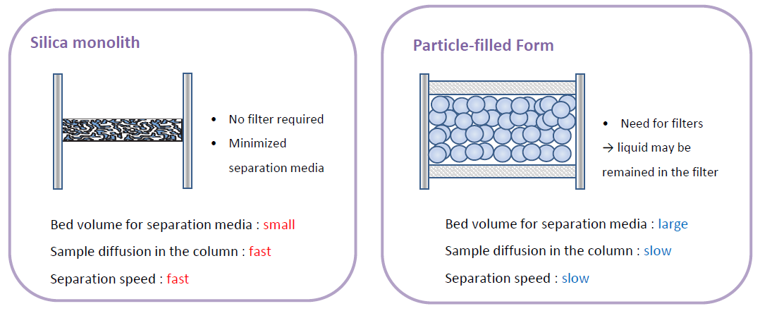 - Despite its high liquid permeability, it is also suitable for fast elution without losing its high recovery as it achieves rapid sample diffusion and separation.