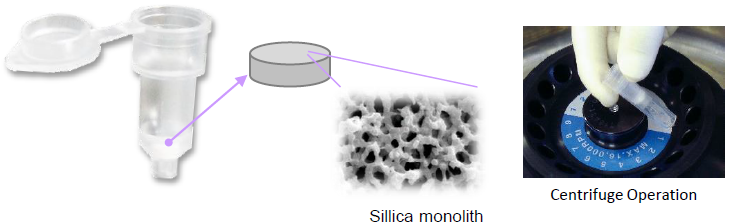 MonoSpin is a solid-phase extraction spin column that uses silica monoliths with uniform continuum pores. It effectively and rapidly extracts, isolates, purifies, and concentrates samples by centrifugation.